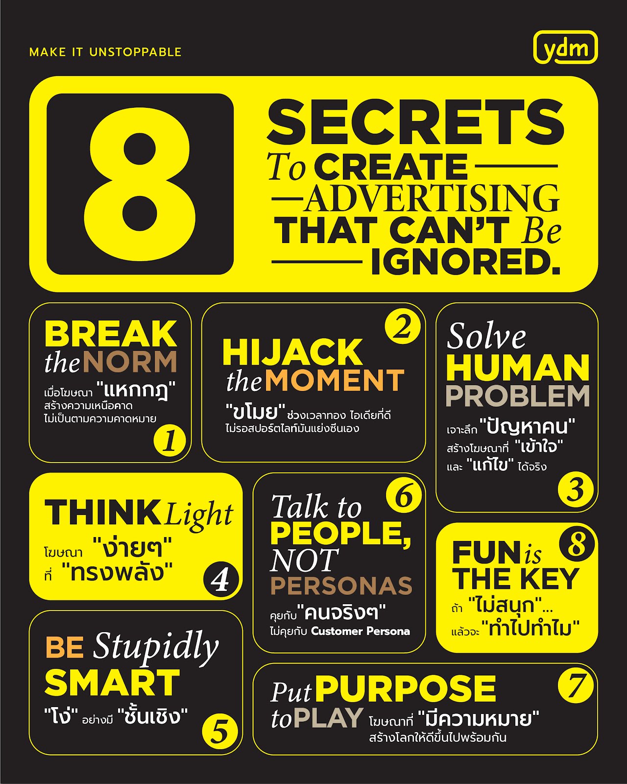 8. Fun is the Key: "ถ้าไม่สนุก.. แล้วจะทำไปทำไม: ความสนุกคือแรงดึงดูด และเป็นสิ่งเดียวที่คนไม่กดข้าม ความน่าเบื่อไม่เคยมีตัวตน และถ้างานของคุณไม่มีใครเห็นแล้วเราจะขายของได้อย่างไร ลองใช้ความสนุกหยุดคนให้มอง หัวเราะ ยิ้ม หรือรู้สึกบางอย่าง ถ้าชิ้นงานของเราสามารถทำคนหัวเราะ ทำให้เขาหยุดเลื่อนจอ คุณก็ชนะแล้ว อย่าขอความสนใจจากคน สร้างมันด้วยความสนุกที่ใครก็ต้านไม่ได้